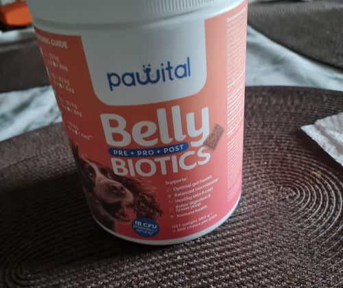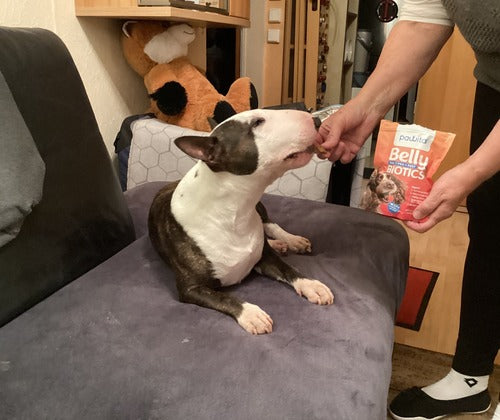 Odkar jemljemo Belly Biotics, je Perlina prebava odlična. Perla prihaja iz Romunije iz zavetišča in ima zelo občutljiv želodec.