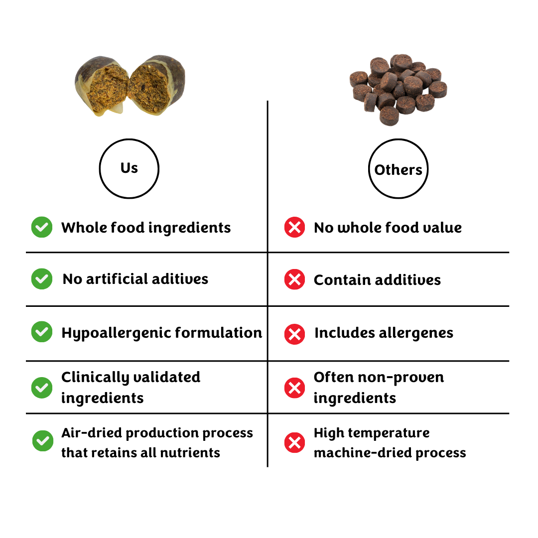 Wiederherstellung der Darmgesundheit: Unsere 10 Milliarden KBE Probiotika (einschließlich deutsches Biosprint® und japanisches Calsporin®) bringen das Darmmikrobiom Ihres Hundes wieder ins Gleichgewicht. Da 70% des Immunsystems im Darm sitzen, stoppt die Behebung von Darmproblemen oft Hautprobleme an der Quelle.